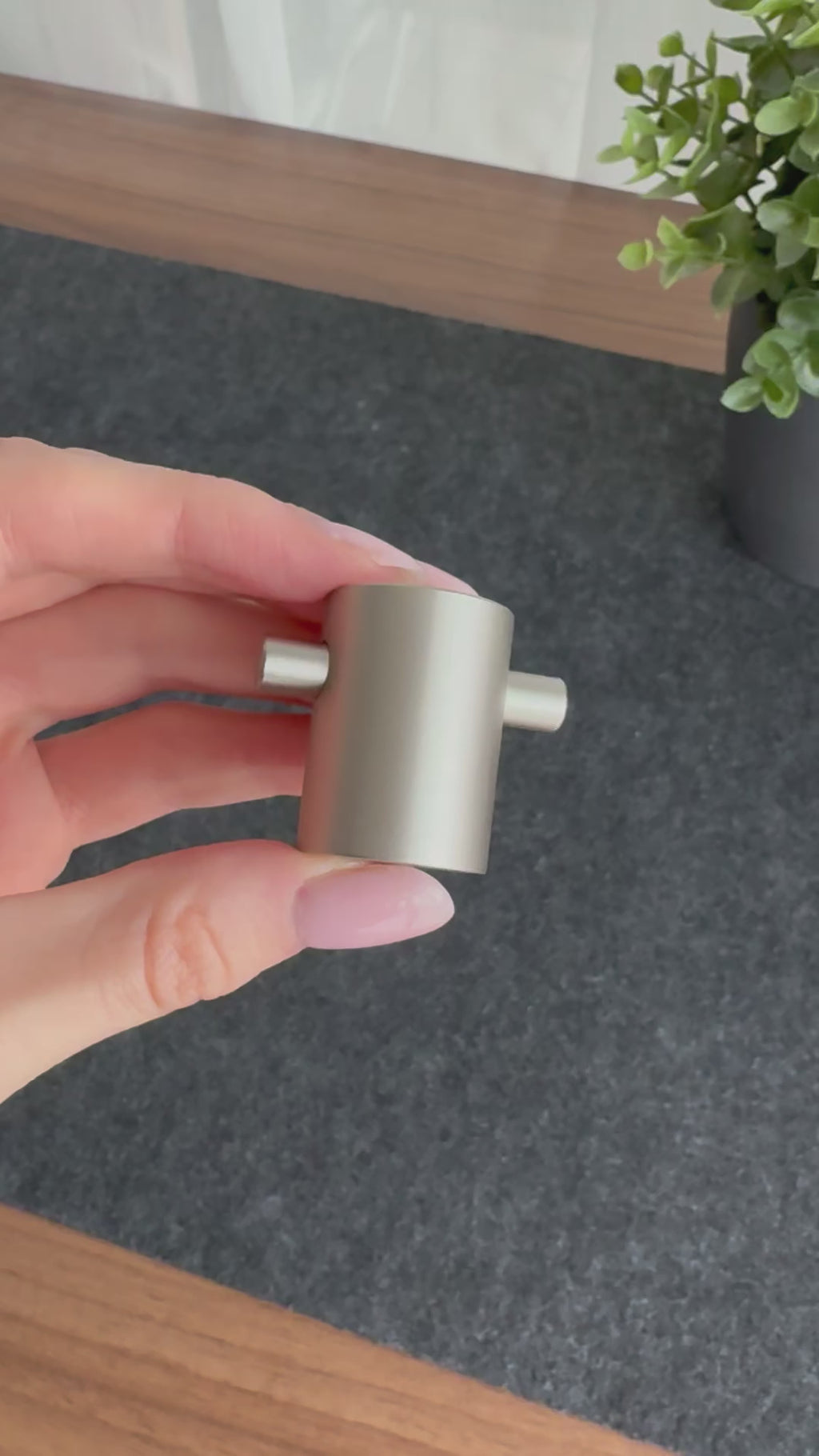Elegant sylinderform med sidegrep og kjølig, børstet nikkelfinish. Laget av massiv messing og passer perfekt til lyse skap, gråtoner og moderne interiør.